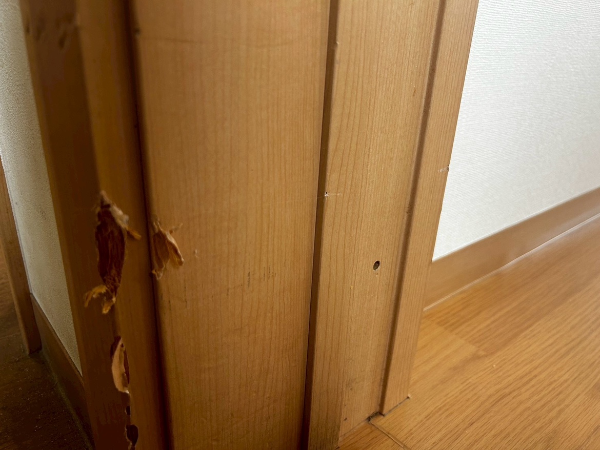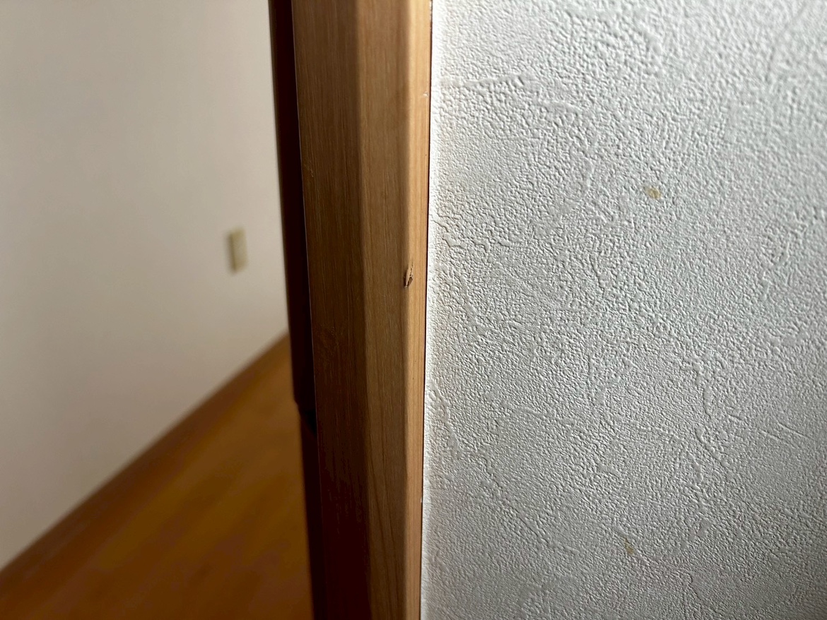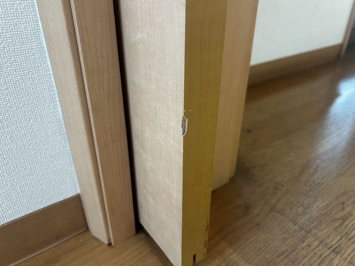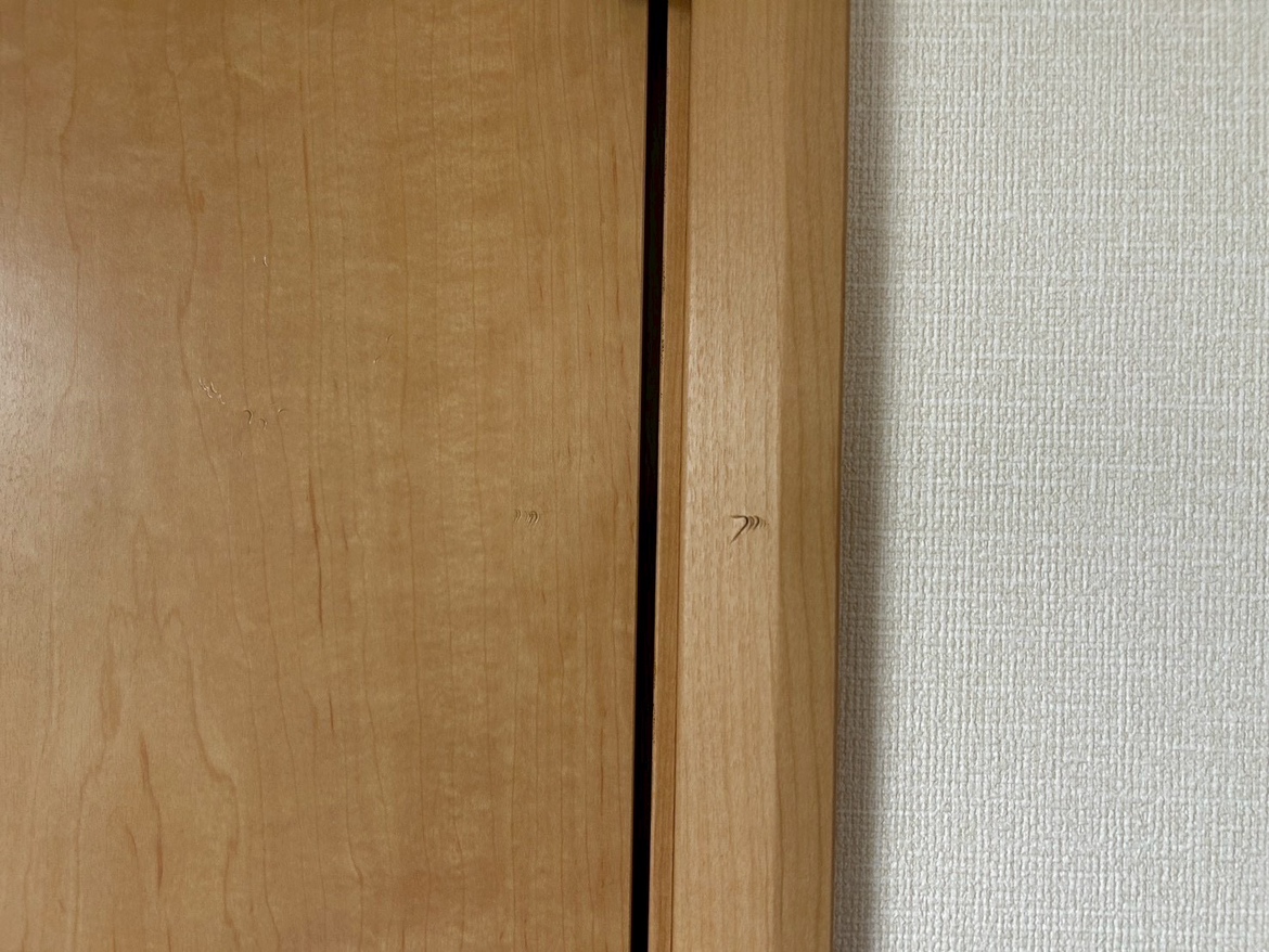 車いすで生活をしている入居者様が多いと言う事でした。今回の傷も車いすでぶつけてしまったような傷でかなり目立っていましたが、リペア後は気になる事のない空間に仕上がりました。