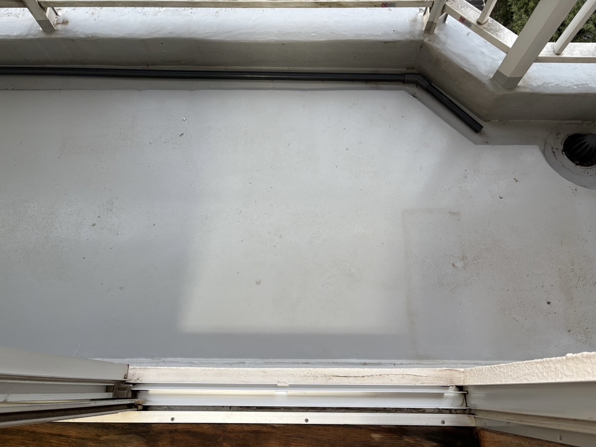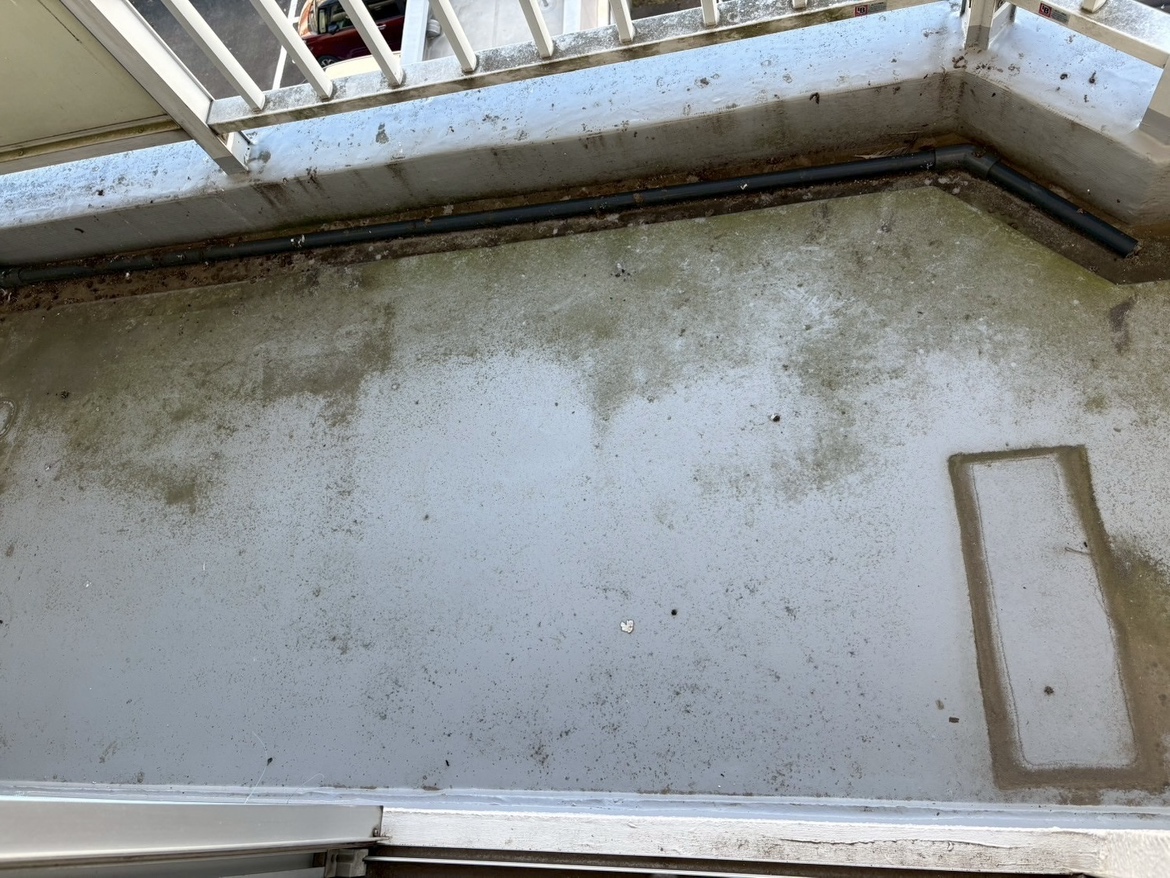 ベランダはカビや砂ぼこりが溜まりやすいです。 高圧洗浄機を使って綺麗にしていきますが、周囲には十分気を付けながら作業を進めます。