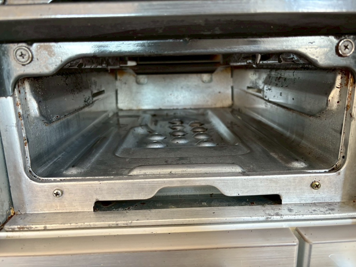 焦げが固まってしまって、黒ずんでいました。 傷をつけないように削りながら、薬剤を使いながら落としていきました。