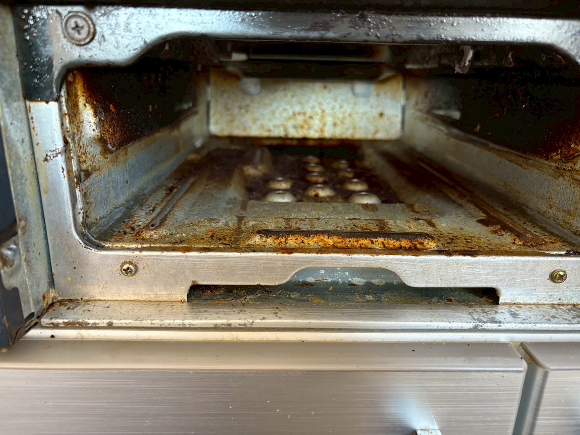 汚れが固まってしまっていたり、水垢や油汚れで汚れが多く付着していました。 酸性洗剤を使用して水垢などを除去していきますが、金属部に長時間つけてしまうと薬剤焼けを起こしてしまうので注意しながら作業を進めます。