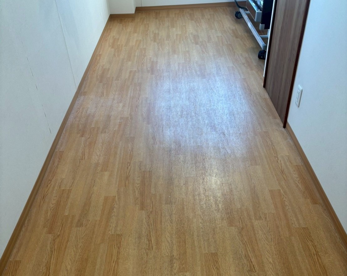 古くなって汚れがひどくなったワックスを剥離剤を使用して剥がしていきます。 クロスに付かないように周りにはしっかりと養生を貼ってから作業を進めます。 ポリッシャーという機械を使って丁寧に古いワックスを剥がしてから、汚水を取り、洗浄を行った後に新しいワックスを塗布します。 ワックスを重ねて塗りすぎてしまう事で汚れがどんどんワックスの下に溜まって落としづらくなってしまうので、剥離を行う事で床本来の美しさを取り戻すことができます。