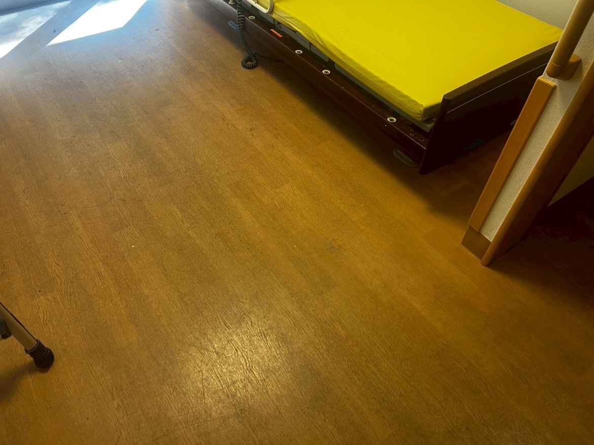 黒ずみが居室の床全体に広がっていましたが、手作業で全て落としました。 こちらの写真は入口付近なので特に汚れが目立ちました。 水気をふき取ってからワックスを塗布し乾かすことでAfter写真のような仕上がりになります。 床が綺麗になるだけで居室内が少し明るくなったような気がします。