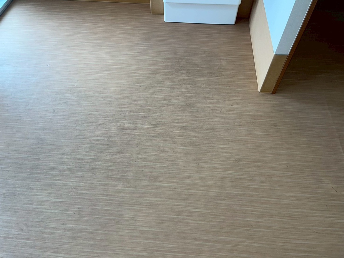 床が全体的に黒ずんでしまっていました。 アルカリ性の洗剤を使って手でこすって落としていきます。 頑固な汚れもありましたが、薬剤を付けて時間を置くなど工夫しながら作業を進め、綺麗にすることができました。