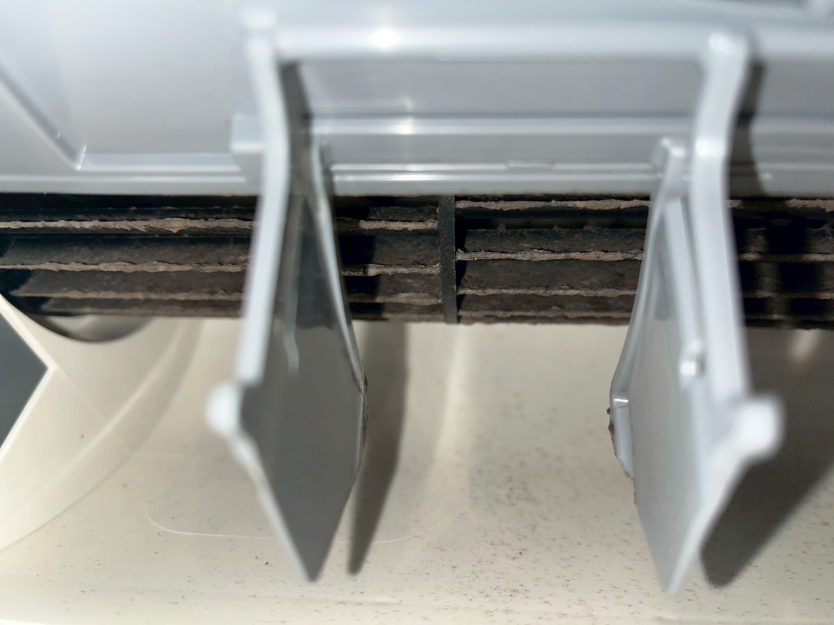 エアコンも汚れが目立ち、カビが付着していました。 高圧洗浄機を使って内部までしっかりと汚れを落としていきます。